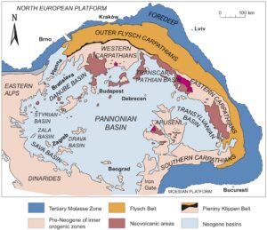 Internal zones in the western and eastern Carpathians expose older Variscan igneous massifs reworked into Mesozoic thick and thin-skinned nappes. During the Middle Miocene this zone was affected by intensive calc-alkaline arc volcanism that developed over the subduction zone of the flysch basins (Pécskay et al. 2006; Lexa et al. 2010). At the same time, the internal zones of the orogenic belt were affected by large extensional structures of the back-arc Pannonian Basin (Royden et al. 1983; Dolton 2006). The last volcanic activity occurred at Ciomadul in central Romania about 30,000 years ago (Molnár et al. 2019; Lahitte et al. 2019; Karátson et al. 2019). Described complex and intensive geological evolution of Carpathians is a reason why this relatively small area is characterized by exceptional geodiversity.
