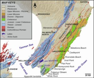 The geology of Wairarapa is complicated by deformation resulting from uplift of west-dipping thrust faults and congruent folding and the presence of later NE-SW orientated strike-slip faulting (Lee and Begg 2002). This deformation, associated with shortening along the Hikurangi margin, most likely commenced around the inception of the subduction margin c. 25Ma, that intensified in the early Pliocene and continues today (Ilies and Josan 2009).
