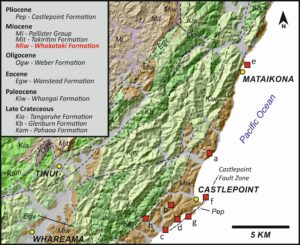 Thin-bedded turbidites of the early Miocene Whakataki Formation are superbly exposed along the shore platform at Mataikona (Lee and Begg 2002). A study on the Waipouriâs Mark shore platform made a detailed record of the number and thickness of beds and their position utilizing aerial photography, field measurements and some geophysical techniques (Field 2005). The detailed study identified about 360 sandstone beds across a 32 m thick section and three (3) lithofacies associations recognised (Field 2005). The data were integrated into a detailed sedimentology study of the location to establish the time and process needed to form the exposed rocks. The study found the Whakataki Formation accumulated over a 3 million year long time period somewhere between 23.5 and 20.5 Ma (Morgans et al. 1996).