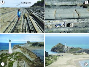 The area around Castlepoint provides superb exposures of layered sedimentary rocks ideal sections, both coastal and inland, illustrating the basic principles of geology (Fig. 10D). Geosites access along coastal shore platform is easy at low tide and here exposures of classic Bouma sequences associated with turbidity current deposits are clearly visible (Fig. 10D). There are locations where textbook style exposures can be seen and these could be developed into dedicated geoeducational sites where the basic concepts of geology could be passed to the general public.