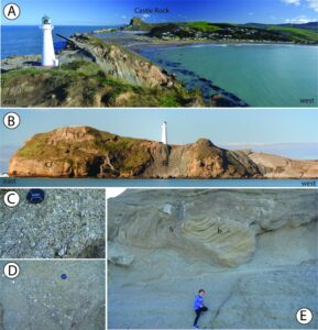 One popular destination on the east coast is Castlepoint, about 30km east of Masterton. Castlepoint is a small settlement with about 100 permanent residents with basic service facilities. It is an end of the road location from where key sites pertinent to understanding New Zealandâs most recent geological history can be accessed. Castlepoint itself is a spectacular landscape feature standing 160 m above the present-day sea level. Its steep eastern side faces directly out to the Pacific Ocean (Fig. 4C). These young strata are fault bounded on the landward side from Miocene turbidite rocks (Whakataki Formation) (Lee and Begg 2002). This structural relationship has created a castle-shaped cliff, consisting of the Castle and the Reef, and a partially open laguna (Fig. 4D). The main rock types are accessible cliffs in the area that dip gently westward and consist of limey sandstone and fossiliferous limestone. The succession records marine sedimentation about 2 million years ago (Johnston 1973). The fossil assemblages were thought to record environmental changes from a cold marine environment to warmer conditions within the Pleistocene (Johnston 1973), but a recent study provided a different interpretation of the complex geology of Castlepoint (Buckeridge et al. 2018). The main lithostratigraphic unit cropping out in the region is early Pleistocene (early Nukumaruan) Castlepoint Formation (Fig. 5A). It contains a diverse molluscan, bryozoan and barnacle assemblage, with a few brachiopods, corals, echinoids, crabs and polychaetes, comprising mixed warm- and cool-water taxa and outer shelf and shallow-water taxa (Buckeridge et al. 2018). Early studies of this mixture of warm and cool-water faunal assemblage was interpreted as suggesting some sort of time-progressive change from one climate to another and linked to specific stratigraphic horizons. However, a recent study has demonstrated that most of the fossils are mixed together, they are commonly fragmented (Fig. 5B) and accompanying sedimentary structures within the beds include fluid release structures (Fig. 5C), steep original dips, large load casts (Fig. 5D) and displaced blocks (Buckeridge et al. 2018). All of these are better explained by an energetic and very dynamic sedimentary environment. In the latest interpretation it is suggested Castlepoint consists of a rock succession that formed by gravity sliding into a narrow canyon, which collected variously sourced remains of shells and sedimentary grains or semi-consolidated blobs of sediments. The barnacle- and bryozoan-rich molluscan coquina, named as barnamol and bryomol respectively, that makes up much of the Castlepoint Formation comprises a thanatocoenoses resulting from transportation of shallow-water elements, which accumulated deeper-water taxa in transit, to settle in a shelf-edge canyon environment (Buckeridge et al. 2018). This new model fits very well to recent geosystems on the seafloor around the convergent plate margins in the New Zealand realm (Micallef et al. 2014), hence the Castlepoint geosite itself tells a very important story that can be utilized for public geoeducation. The site could also be used to demonstrate the dynamic sea-floor processes commonly linked to major thrust earthquakes along a convergent margin (Reyners 1998), such as the active Hikurangi subduction zone about 100 km away from the present day location of Castlepoint.