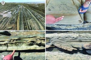 To the north of Castlepoint, via a sealed road, is the Whakataki Coast where a 20 km long, broad coastal platform exposes the most spectacular turbidite successions in New Zealand. Most of the sites are exceptionally well exposed during low tide enabling visitors to access an impressive succession of tilted mudstone â sandstone interbeds preserving complete to near-complete Bouma sequences (Fig. 6A). The beds record various dynamic processes that operating on the sea floor when sediment is transported from a landmass to deep marine environment over a period of tens of thousands of years. The succession is impressive and includes various turbidity current channels containing central to marginal facies showing how sediments are dispersed from the shelf region into abyssal depths. Individual beds can be traced along the shore platform and facies changes can be observed directly. Thickly bedded, channelized Bouma sequences, some complete and some partial, represent turbidite channels or main arteries, whereas in areas where the units are more regularly bedded and missing Ta (sand) sections of Bouma sequences more likely represent overbank of turbidite facies (Field 2005).