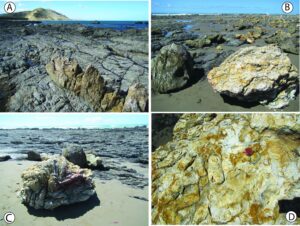 Another very interesting feature along this coast is a structural zone (Fig. 7A) where sediments are fractured, folded (Figs. 7 B & C), displaced and display a minor metamorphic overprint (Fig. 7D). In places rocks from Early to Mid Cenozoic successions have been caught up in the flysch successions forming small to medium size olistoliths of exotic rocks. These olistostromes provide another geological perspective of the active processes that are operating out into the deep marine environment (Lee and Begg 2002).