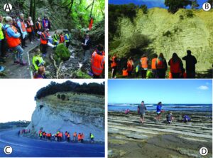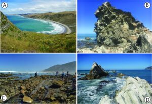 Massey University Earth science undergraduate field courses have undertaken mapping projects in the East Coast, from Makuri east of Dannevirke to Castlepoint Station (Fig. 10D) and south to Honeycomb Rock and White Rock. Here students tackle complex geological problems involving faulting and folding related to accretionary prism development. The experience and knowledge gained during these field courses have led the authors to realise the enormous geoheritage value of the region and the need for it to be promoted to the general public through geoeducation programmes.