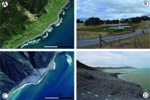 Southwards along the coastline features with geoheritage potential include White Rock (Fig. 8D) and the eastern margin of the Aorangi Range where there is outstanding exposure of greywacke basement rocks and huge landslide fans. Along the shore platform regular uplift has preserved an outstanding sequence of raised beaches that have been correlated with major earthquakes (Figs. 9A & B). These raised beach sites, such as those at Tora (Fig. 2), provides a unique neotectonic record of the region. Immediately inland there is archaeological evidence of human occupation of the fertile coastal zones and the tsunami events that almost certainly impacted them. These features are pristine due to the remoteness of area and this gives them added geoheritage value such as young landslide fans along the Aorangi coast (Figs. 9C & D).