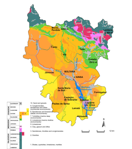 Many of the geological formations of the Geopark present a major tectonic deformation that records the main events that built the Pyrenean orogen, providing excellently preserved examples of the relationship between tectonics and sedimentation (Mochales et al. 2012) and how this is reflected in the fossils preserved through time. The relief, with a marked structural character, is built around the Cinca River. Glacial, periglacial and karst landforms predominate in the high mountains, whereas terraces, glacis, gullies and bedrock rivers are characteristic of the central and southern areas.