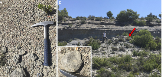 Figure 2. A) Detail of the nummulite beds in the Santa Maria de Buil area. B) Coral colony. C) Coral biostromes close to the top of the nummulite sequences.
