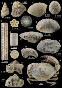 Figure 3. Invertebrate fauna from the Grustan (A-M, O, P) and San Vicente Formations (N). A) Indeterminate gastropod. B-D) Fragments of echinoids (Cidaridae; Cassiduloida indet. Spatangoida? respectively). E-H) Isselicrinus sp.? I) Nummulites sp. J-K) indeterminate carpiliid, in frontal and dorsal views, respectively. L) Indeterminate xanthid, in dorsal view. M) Dactyl of indeterminate decapod. N) Harpactoxanthopsis quadrilobata (Desmarest 1822). O) Millepora sp.P) Leptoseris santaciliaensis?