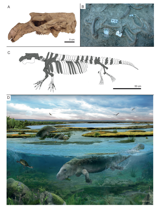 Figure 4. A) Skull of the basal sirenian Sobrarbesiren cardieli (holotype, MPZ 2017/1), in lateral view. B) Bone accumulation of Sobrarbesiren in the Castejón de Sobrarbe-41 fossil site. Photograph: Ainara Badiola. C) Reconstructed composite skeleton of Sobrarbesiren cardieli. Grey elements represent the fossils known (from DÃaz-Berenguer et al. 2018). D) Life restoration of Sobrarbesiren, which inhabited a deltaic plain in the Comarca of Sobrarbe (Huesca, Spain). Palaeoillustration by Rosa Alonso. Reproduced by permission of the Museo de Ciencias Naturales de la Universidad de Zaragoza.