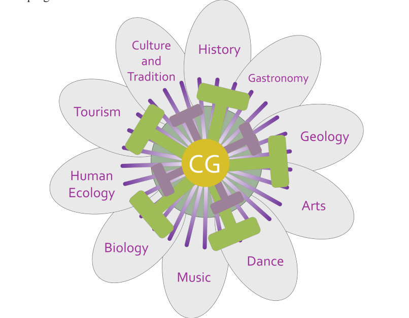 Figure 4. Main themes of the geopark project in Paraguay, represented in the petals of the national flower of the country, the Mburukuja (Guarani language) (Passiflora caerulea).