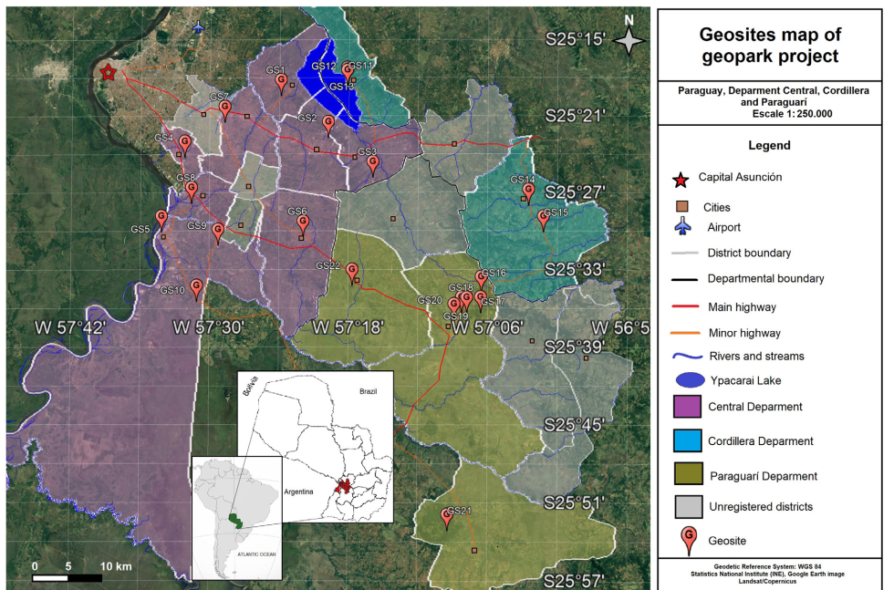 Some local authors have made efforts to inventory the geological and geomorphological heritage, such as Gadea & Benitez (2018), who presented a list of 106 geosites of geotourism interest based on papers. These geosites are located with coordinates by departments, and their geological characteristics group them into the following categories: cavern, paleontology, folding, hydrology, geomorphology, landscape, stratigraphy, mining history, monadnock, tectonics, geoform, paleobotany, columnar sandstones, ethnography, erosion, ichnology, erratic blocks, petrology, Precambrian rocks, dolmen cave, igneous intrusion, volcanic stock, annular complex, landscape volcano, hydrogeology, islet history, glacigenic rocks, paleodunes, cenote landscape, columnar basalts. While this initiative is important, both qualitative and quantitative inventory methodologies should be followed to determine the potential of geosites, geomorphosites, geodiversity sites, etc. Salinas et al. (2021) presented evaluations of the scientific value of two geosites in the metropolitan area of the city of Asunción. These evaluations considered their representativeness, integrity, rarity, and scientific knowledge of the Cerro Koi and Cerro Ãemby sites.