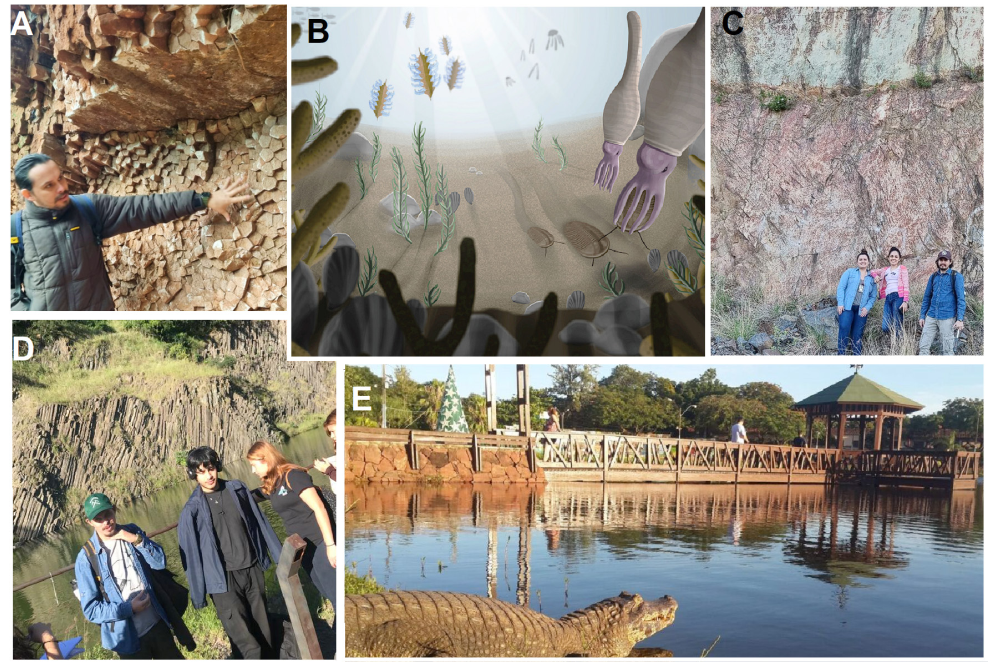 Figure 6. Inventory of Geosites/Geodiversity sites (GS) of the Central Department: A) GS1 Columnar disjunction of sandstones, B) GS2 Paleoecological reconstruction of the Llandoverian fauna (Uriz et al. 2018), C) GS3 Ypacaraà Quarry, wall of rhyolitic rocks, D) GS4 Ãemby Hill, showing Nephelinites with a columnar arrangement, E) GS11 Itá Lagoon with a caiman out of the water (By UH).