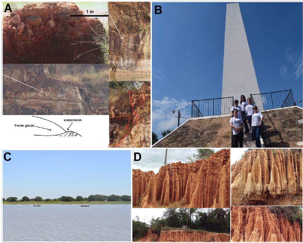 Figure 7. Inventory of Geosites/Geodiversity sites of the Central Department: A) GS9 presents various geological features, breccias, load structures, clastic dikes, and faults (Salinas et al. 2019), B) GS10 is a historical monument of the Paraguayan War, C) GS5 represents a geosite located on the banks of the Paraguay River (by ABC color), D) GS11 are geoforms resulting from water erosion (BogarÃn et al. 2015).