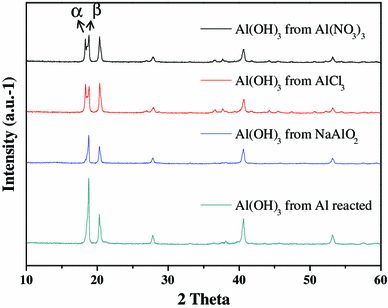 exhibits two mixed phases, i.e. α (gibbsite) and β (bayerite), while those obtained from NaAlO