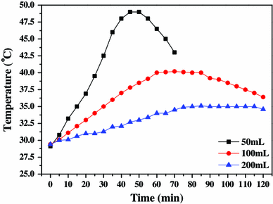 , temperature of the reacting flask increases due to the smaller amount of water, as shown in Fig.