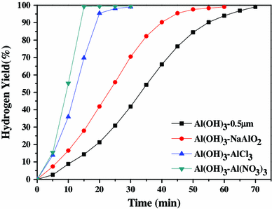 . The yield “100 %” means the theoretical value of 1,360 ml hydrogen generated per gram Al metal in water. The performance of Al(OH)