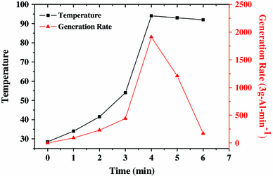 . The hydrogen generation rate reaches its peak at the fourth minute where the system temperature is also at its peak. The peak rate is as high as 1,920 ml per 3 g Al-min