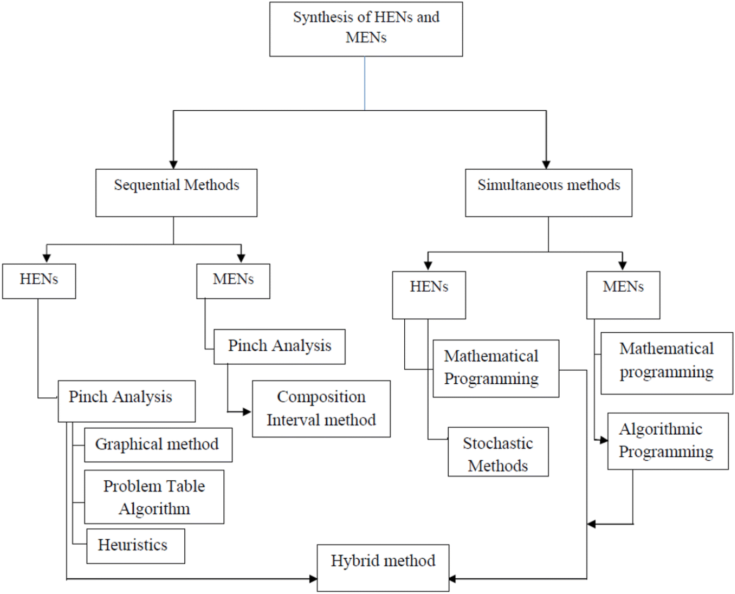 capture using solid sorbents have not been given much attention in literature. Application of HENs and MENs in this field could proffer a solution to energy and material minimization. Major techniques that have been used to synthesize HENs and MENs in the past have been summarized in Fig.