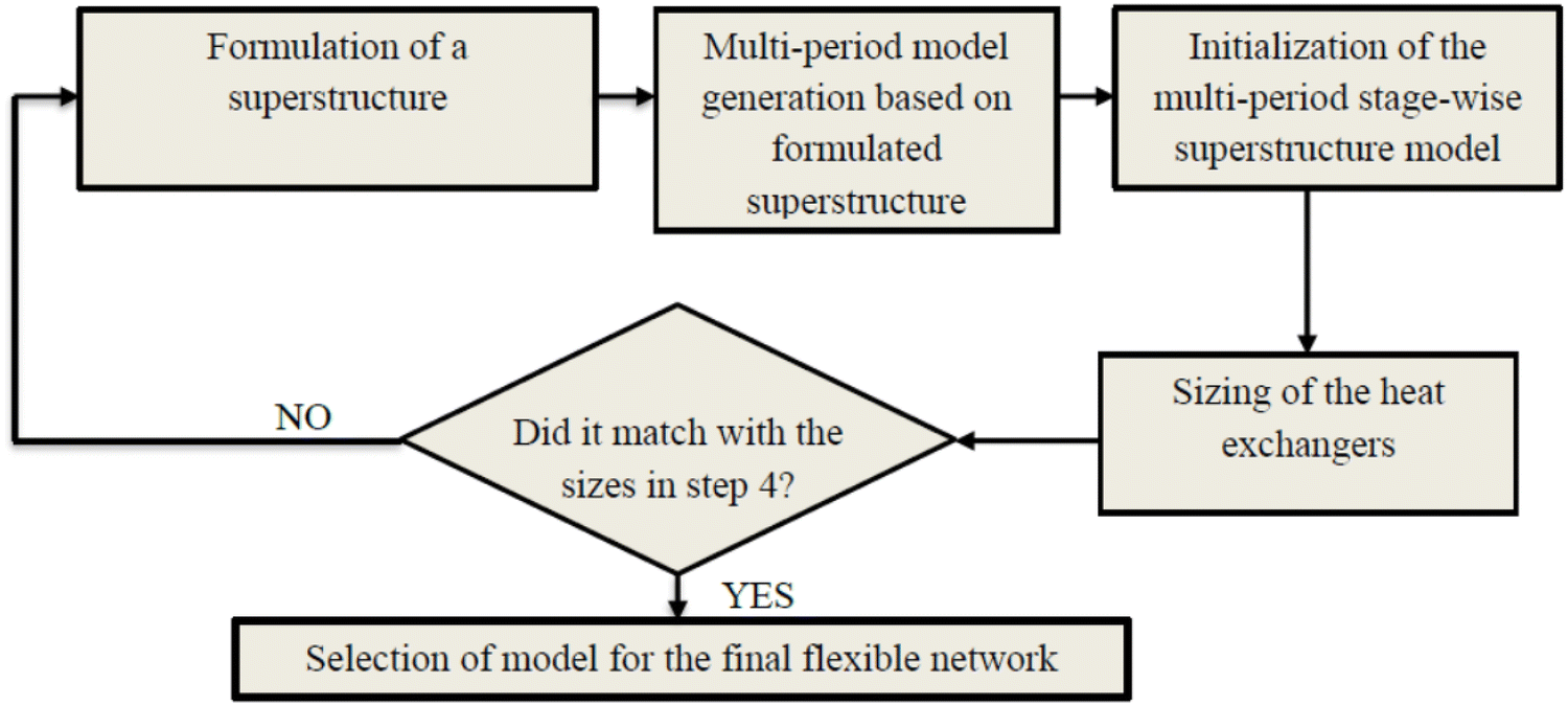 ]. Trade-offs between capital cost (fixed costs of heat/mass exchanger units and area costs) and operating cost (cost of hot and cold utilities) are considered in a single optimization framework. A schematic step by step procedure for simultaneous synthesis of a heat exchanger network that can operate with different sets of conditions, such as temperatures and heat loads, are presented in Fig.