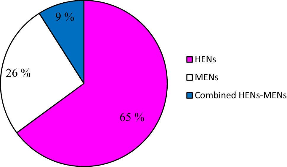 Figure 9 shows that in 77 contributions, the mathematical programming (MP) method was applied; pinch analysis (PA) technique was used in 244 contributions, while a combination of a combined pinch analysis and mathematical programming (PA–MP) was applied in 18 contributions. It is evident that the pinch analysis technique is well researched and has been used the most by researchers in the field of process integration. In addition, mathematical programming techniques in HENs and MENs synthesis was first introduced as early as 1977, but its application for energy and material minimization was not fully considered afterwards. According to the time frame considered in this review (1990–2018), full application of mathematical programming for environmental sustainability studies was reported only after 2002, while the combination of pinch analysis and mathematical programming started in 2003, and till date it has not been adequately researched compared to other methods. It is also worthy to note that there has been an increasing number of publications in the application of process synthesis techniques in the last 8 years (2010–2018). Figure 10 shows that 65% of the aforementioned contributions were used in heat exchanger network (HEN) synthesis, and 26% of the reported techniques were applied in mass exchanger network (MEN) synthesis, while a combined HEN and MENs synthesis accounted for only 9%. The trend observed in this section reveals that combined pinch–mathematical programming techniques for the synthesis of a combined heat and mass exchangers still need further research and development research and more concerted research efforts should be directed towards it. Hence, it forms a major recommendation from this review.