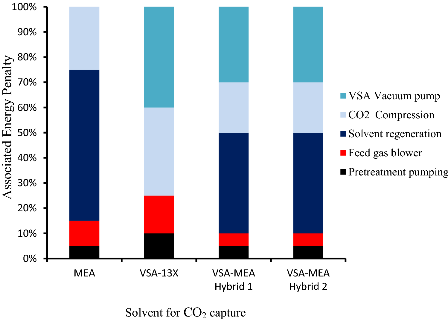 One important issue that needs to be considered in most CO 2 capture methods is the high energy requirement, because energy availability is an important global issue. High energy penalty and excessive use of external utilities are another challenge confronting the capture of CO 2 from power plants [ 112 ]. CO 2 compression and sorbent regeneration during CO 2 capture account for about 92% of the energy penalty associated with most carbon capture and storage technologies [ 113 ]. For instance, a typical CO 2 capture system that is based on monoethanolamine (MEA) requires a significant amount of energy at about 3.0–4.5 GJ/t CO 2 to regenerate the solvent in the stripper reboiler as well as energy for the stripper feed which is usually provided by cooling of the lean solvent [ 114 ]. According to a report by Zenz-House et al. [ 115 ], energy penalty associated with retrofitting CO 2 capture devices into existing power plants is estimated between 50 and 80%. A further analysis of the thermodynamic limit indicates that energy penalty during CO 2 capture can be improved by harnessing the available waste heat and improving the second-law efficiency of temperature-swing adsorption systems [ 116 ]. Zenz-House et al. [ 115 ] postulated that in real-life situation, it is difficult to attain an energy penalty reduction below 25% during post-combustion CO 2 capture. The authors also indicated that to offset the energy penalty incurred during capture and storage, about 80% CO 2 emissions will require either an additional 390–600 million tonnes of fuel, additional 69–92 gigawatts of CO 2 -free-baseload power, or a 15–20% reduction in overall electricity usage. CO 2 capture units also require power to operate the gas compressors and other auxiliary equipment. Heat energy is also rejected from the stripper and compressor during CO 2 capture and compression. Retrofitting CO 2 capture devices in existing power plants will lead to a deficit of heat in the plant which has generally been proposed to be overcome by supplying heat and extracting steam from the turbine to the stripper reboiler [ 116 ]. This subsequently reduces energy expenditure, but drops the net efficiency of the power plant by approximately 30–40% [ 117 ].