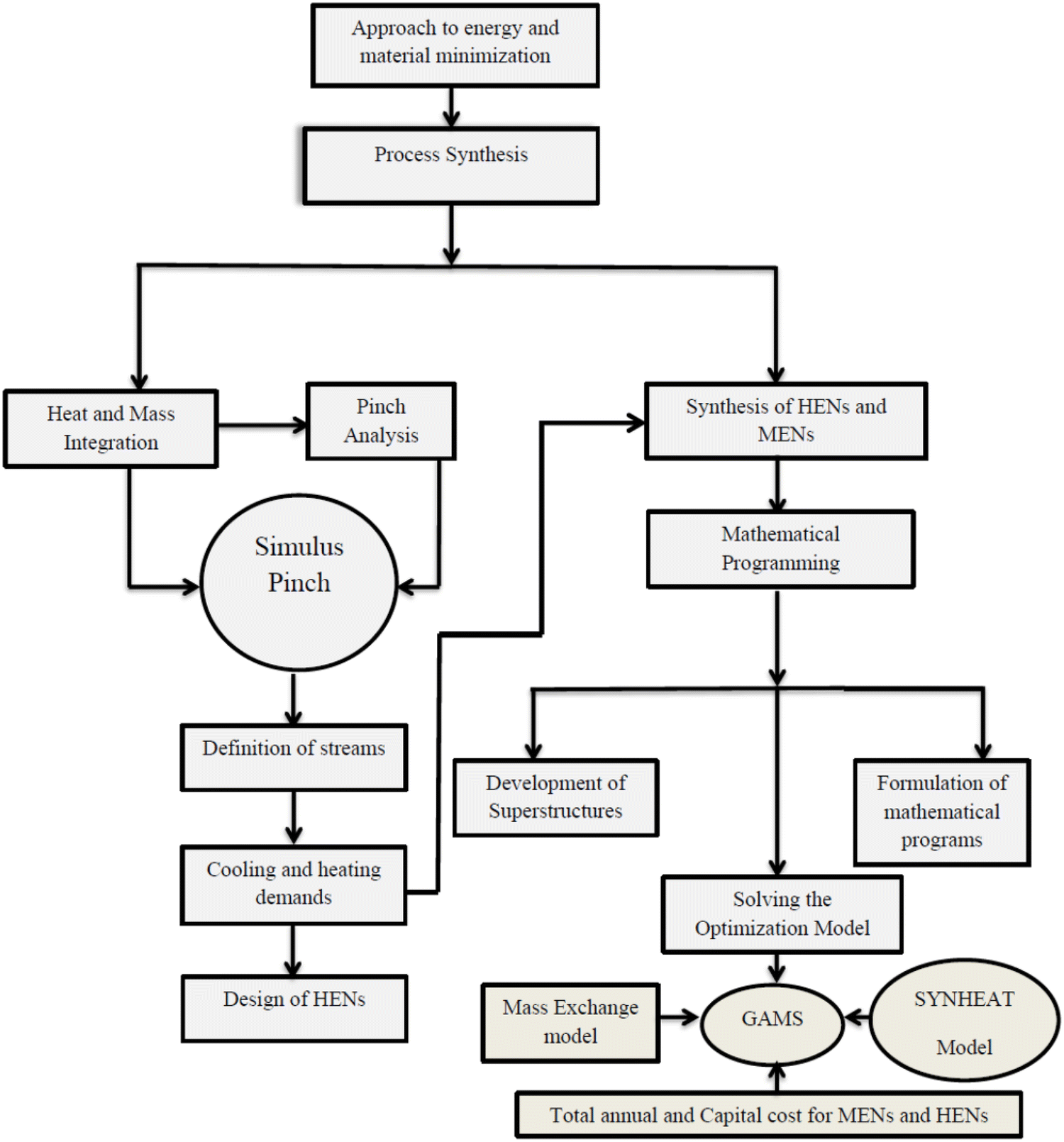 capture. Pinch analysis techniques should be used to set the energy targets, while mathematical programming can then be used to synthesize the networks by building upon the existing SYNHEAT model in General Algebraic Modeling System (GAMS) software. A detailed methodology for this is diagrammatically presented in Fig.