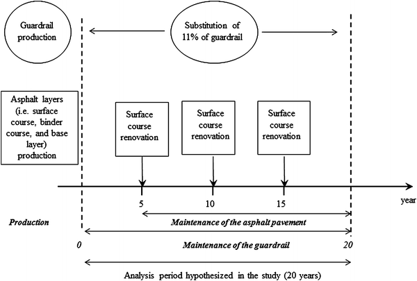 The study presented here was developed by considering a 20-year period of utilization of the infrastructure. Although this assumption clearly represents a conventional hypothesis, it seems to be a fair trade-off between reliable estimations of traffic, materials used, working techniques involved, and the embedding of several maintenance activities. It is remarkable to note that in this study, 20 years do not represent the lifespan of neither the road nor the guardrail under analysis. In Fig.