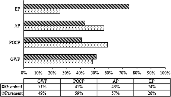 Percentage contribution of the infrastructure (pavement and safety barrier) and traffic on the whole environmental impact Impact category Environmental indicator Pavement + guardrail (%) Traffic (%) GWP Kg CO2 eq 13.97 86.03 POCP Kg C2H4 eq 0.03 99.97 AP Kg SO2 eq 0.62 99.38 EP Kg PO43− eq 27.81 72.19Table 5