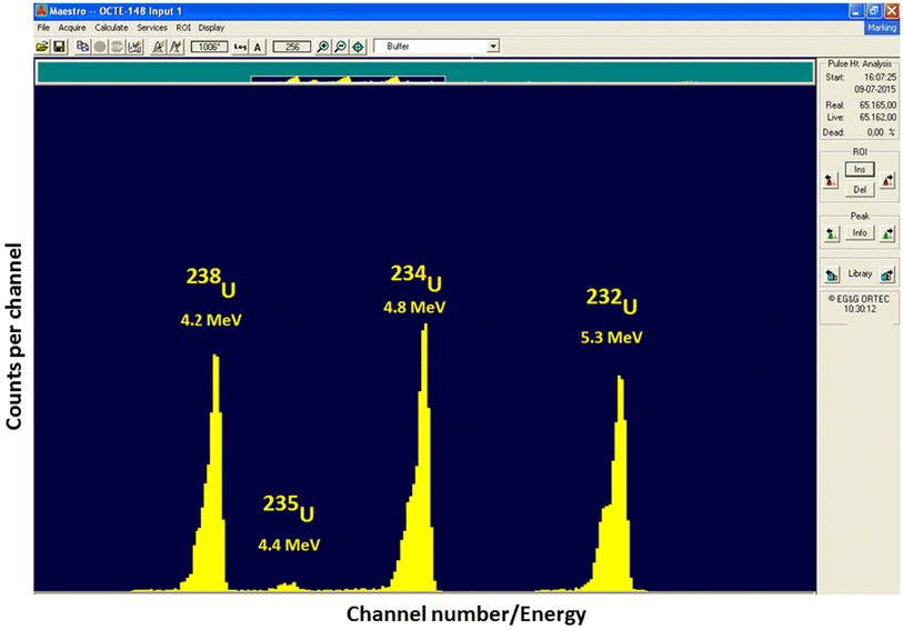 Alpha spectrogram of environmental sample with the peaks of alpha particles emitted by the three naturally occurring uranium isotopes (