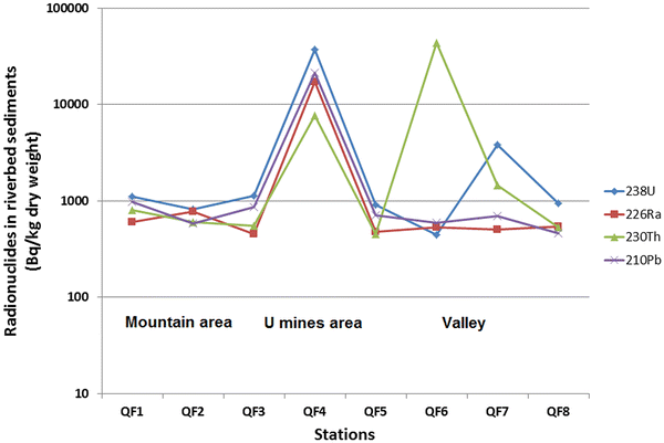 ). Radionuclides in plants grown near the uranium mine sites showed enhanced values, i.e., above the natural range of concentrations, especially at station QF2, but otherwise they were generally within the range of natural background concentrations.