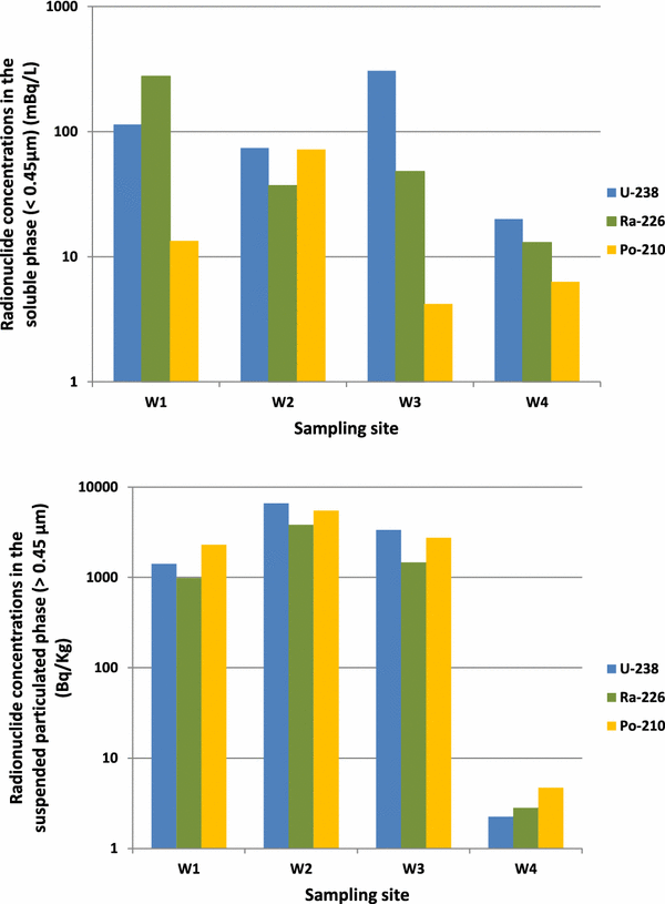 Concentrations of radionuclide in the soluble phase (<0.45 µm) and suspended particulate phase (>0.45 µm) of water from irrigation wells Sampling site 238U 235U 234U 230Th 226Ra 210Pb 210Po 232Th Dissolved phase (mBq/L ± 1 SD) W1, Well Águas Belas 114 ± 3 5.1 ± 0.2 110 ± 2 1.4 ± 0.4 276 ± 27 147 ± 6 13.4 ± 0.6 0.6 ± 0.3 W2, Well Quarta-Feira 74 ± 2 3.3 ± 0.2 73 ± 2 6 ± 1 37 ± 2 42 ± 2 72 ± 3 0.7 ± 0.2 W3, Well near the Bica mine 306 ± 9 16 ± 1 301 ± 8 0.60 ± 0.06 48 ± 4 48 ± 2 4.2 ± 0.2 0.10 ± 0.02 W4, Well Caldeirinhas 20 ± 1 0.90 ± 0.05 19 ± 1 1.2 ± 0.1 13 ± 1 48 ± 2 6.3 ± 0.3 0.070 ± 0.019 Particulate phase (Bq/kg ± 1 SD) W1,Well Água Belas 1410 ± 40 67 ± 6 1420 ± 40 1070 ± 50 980 ± 50 – 2300 ± 110 60 ± 6 W2,Well Quarta-Feira 6610 ± 190 290 ± 30 6770 ± 200 5115 ± 210 3810 ± 170 4850 ± 270 5480 ± 250 350 ± 30 W3, Well near the Bica mine 3345 ± 100 140 ± 15 3370 ± 100 2600 ± 140 1470 ± 180 2380 ± 140 2750 ± 120 180 ± 20 W4, Well Caldeirinhas 2.25 ± 0.08 0.097 ± 0.012 2.46 ± 0.09 – 2.8 ± 0.2 8.5 ± 0.3 4.7 ± 0.2 – Radionuclide concentrations in soluble and particulate phases of water from wellsTable 4