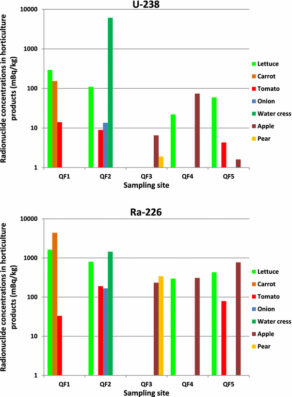 One major vector in contaminant’s transfer usually is the water. Radionuclide concentrations in horticulture products did suggest that the soil is not the main source of radionuclides for root uptake but, instead, could be the irrigation water used [ 19 ]. As water from irrigation wells contained moderate radionuclide concentrations, the horticulture products from this area were not heavily contaminated. In addition, the reference station QF1, Águas Belas, with irrigation water naturally high in radioactivity, displayed products with higher radioactivity content than horticulture plots in the valley (Table 5 ). One outstanding result was radionuclide concentrations displayed by the water cress that seems a strong accumulator for most radionuclides (Table 5 ). These results on radionuclides in water and agriculture products are of value to evaluate the radioactive contamination in foods. However, the computation of internal radiation doses received by members of local population requires further investigation to obtain statistically representative results for human intake of radionuclides with the local diet.