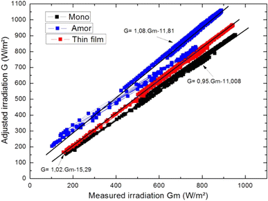 Irradiation adjustment relationship for the three PV modules technologies deduced from 2 days data measurementsFig. 4