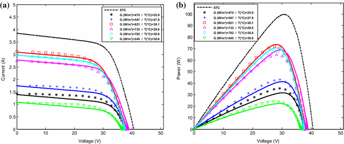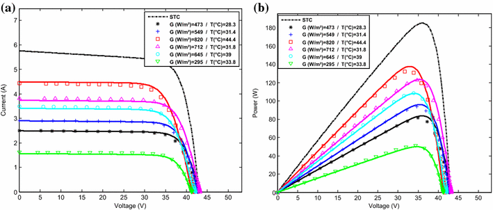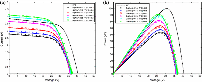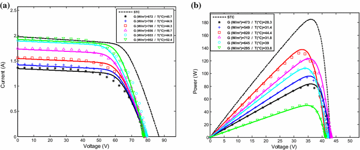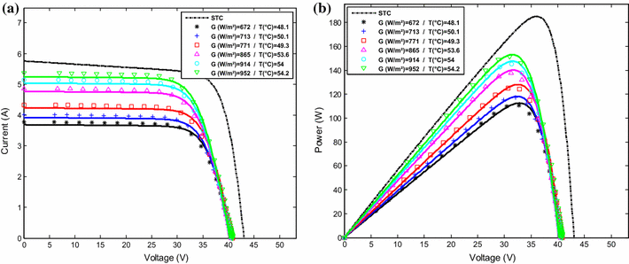 ). The comparisons have been conducted between the outdoor PV module measurements and the simulated results, for two different days; a sunny day (May 11, 2015) and a cloudy day (December 13, 2015). The number of measurements for both I–V and P–V characteristics exceeded 150 per day beginning from 9 am to 4 pm. The results of the comparison are shown in Figs.