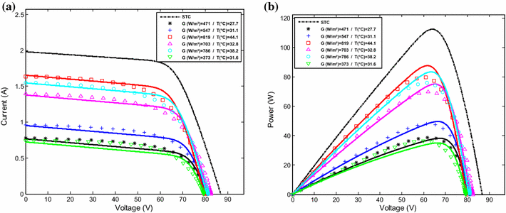 ). For the amorphous PV module, quite large differences were found between the measured the simulated I–V and P–V curve, especially in the case of low irradiations (Fig.