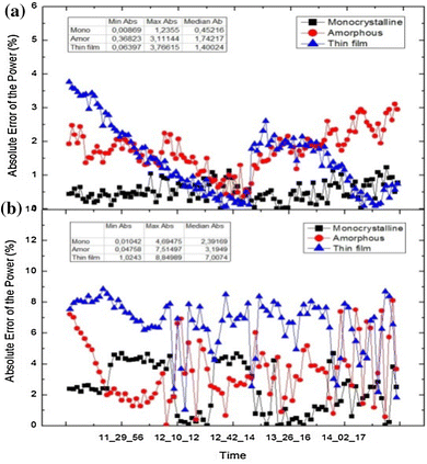 shows the evolution of the absolute error of the power between the measured values and the simulated ones as a function of time, for the 2 days considered. For the sunny day (a), the values of the absolute errors of the power for all the module types are small. The average error is: 0.45% for the monocrystalline, 1.74% for the amorphous and 1.4% for the micromorphous. For the cloudy day (b), the average error is: 2.39% for the monocrystalline, 3.19% for the amorphous and 7% for the micromorphous. As it is shown in Fig.