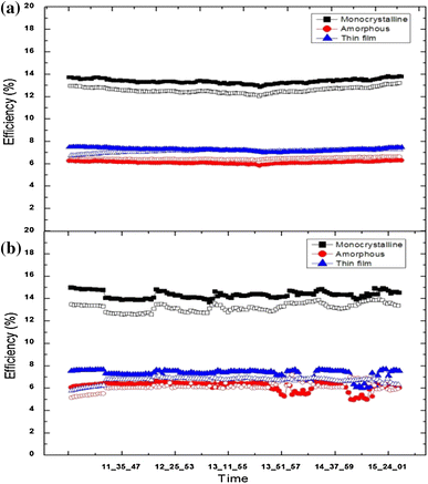 , the gap between the simulated and measured efficiency of the modules versus the time for the 2 days is small for the case of the amorphous and the micromorphous module, but it is relatively high for the monocrystalline module which could be due to the fact that the monocrystalline module is older than the others and in the model used the aging aspect was not taken into account.