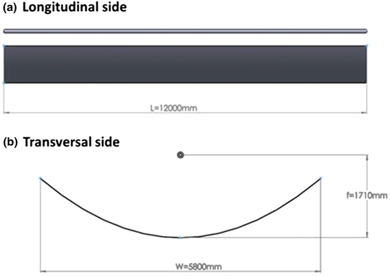 The transversal side of the collector Parameters for the examined model and the simulation Simulation parameters Values Model dimensions Values 0.095 5.8 m 0.88 12 m 1000 W/m2 1.71 m 0.93 69.6 m2 0.92 26.37 0.94 66 mm 5770 K 70 mm 293 K 120 mm 10 W/m2 K 125 mmFig. 1