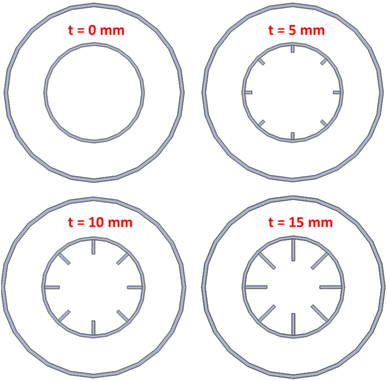 In the present work, the usual smooth tubular absorber is compared with tubular absorbers with internal fins. Eight longitudinal internal fins are selected to be used and three different fin lengths are examined. More specifically, 5, 10 and 15 mm are the selected fin lengths that are investigated and the objective of this analysis is to determine how the length of them influences on the collector performance. In all the cases, the thickness of the examined fins is equal to 2 mm and the fins are located along the absorber tube. Figure