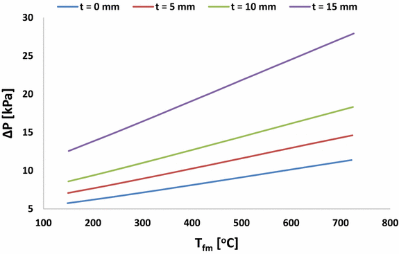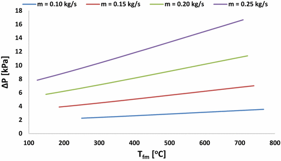 It is essential to state that higher mass flow rate leads to higher thermal efficiency but simultaneously to higher pressure losses; two contrary factors for the exergetic performance of the collector. Figure 5 shows the pressure losses among the examined cases. It is obvious that the pressure losses increase with the increase in the operating temperature level and with the mass flow rate. Moreover, it is noticeable that the distance between the curves of Fig. 5 is greater for higher mass flow rates. This observation makes clearer the reason for finding that the optimum mass flow rate exergetically is not so high.