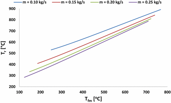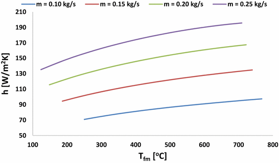 The next step after the model development is to run it. Different combinations of the mass flow rates and the inlet temperatures are tested in order to perform a detailed parametric analysis. Four values for the mass flow rate are selected: 0.10, 0.15, 0.20 and 0.25 kg/s. For every mass flow rate, 12 different inlet temperature levels are selected to be tested from 50 to 600 °C with step equal to 50 K. In every case, the outlet temperature of the carbon dioxide is the most important parameter for the thermal performance calculations. Moreover, the pressure losses along the tube are demanded for the exergetic evaluation of the system. The heat transfer coefficient is estimated using the mean fluid temperature (