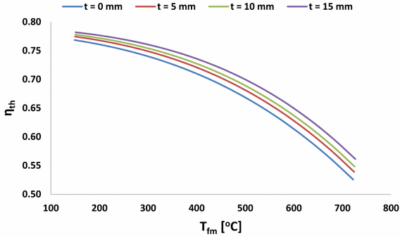 Energetic and exergetic comparison for the examined fin cases with mass flow rate equal to 0.20 kg/s 50 0.7639 0.7704 0.7741 0.7785 0.2971 0.2983 0.2977 0.2932 100 0.7559 0.7632 0.7673 0.7725 0.3499 0.3667 0.3661 0.3460 150 0.7463 0.7544 0.7590 0.7649 0.3894 0.3915 0.3912 0.3866 200 0.7387 0.7473 0.7524 0.7588 0.4088 0.4113 0.4112 0.4066 250 0.7206 0.7303 0.7362 0.7438 0.4359 0.4390 0.4393 0.4346 300 0.7099 0.7203 0.7265 0.7347 0.4444 0.4480 0.4484 0.4438 350 0.6852 0.6966 0.7036 0.7130 0.4533 0.4575 0.4583 0.4537 400 0.6710 0.6829 0.6902 0.7002 0.4540 0.4586 0.4595 0.4551 450 0.6386 0.6513 0.6594 0.6705 0.4489 0.4541 0.4552 0.4507 500 0.6204 0.6335 0.6418 0.6534 0.4432 0.4485 0.4498 0.4454 550 0.5919 0.6053 0.6140 0.6262 0.4315 0.4370 0.4385 0.4340 600 0.5604 0.5739 0.5829 0.5956 0.4159 0.4214 0.4229 0.4184 650 0.5259 0.5393 0.5484 0.5615 0.3963 0.4016 0.4032 0.3983Table 3