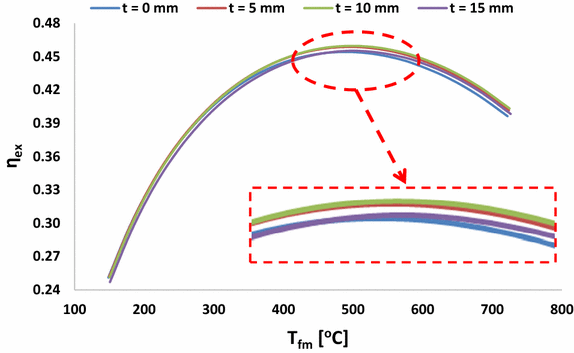 shows the exergetic performance of the collector for the examined absorber cases. All the curves seem to be close to each other but the curve which corresponds to 10 mm fin length leads to the maximum exergetic performance. More specifically, 45.95% exergetic efficiency can be achieved in this case, while 45.86, 45.54 and 45.40% can be taken for 5, 15 and 0 mm cases respectively. The existence of optimum fin length for an intermediate value is a result of the contrary impact of the fin length on the thermal efficiency (Fig.