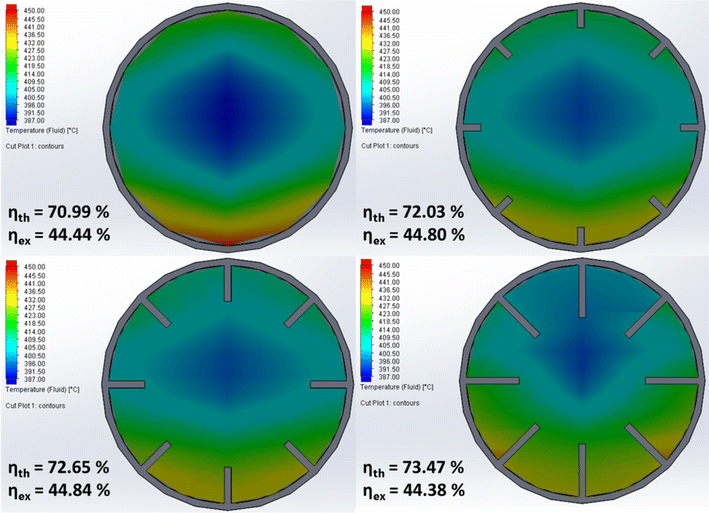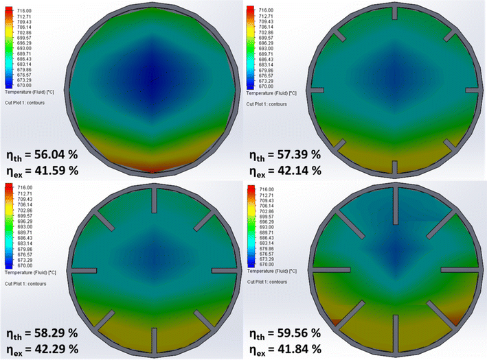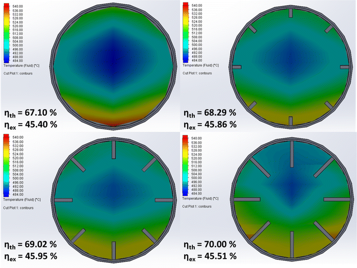 show the temperature distribution of the carbon dioxide in a cross section in the middle of the tube for inlet temperature equal to 300, 400 and 600 °C. In every figure among them, there are four subfigures, one for every absorber case. Generally it is obvious that the fluid is colder in the central core and in the upper part of the tube and it is warmer in the lower part and closer to the tube. The reason for this result is the concentration of the solar irradiation in the low part of the absorber. Moreover, it is obvious that the existence of internal fins removes the warm region in the upper part of the tube, something that enhances the performance of the collector, as it has been stated before.