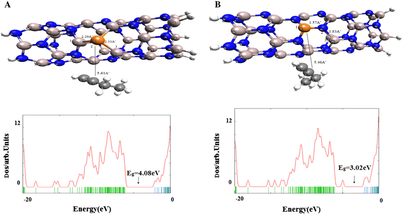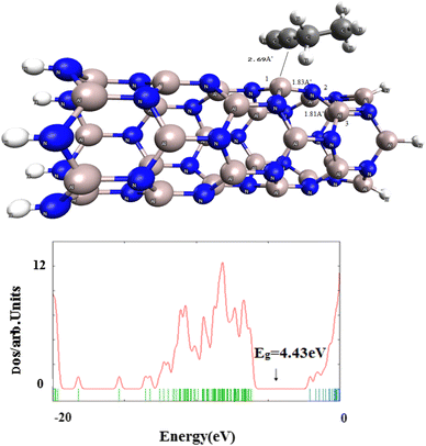 has been obtained using density of state (DOS) software. After adsorption of the ethyl acetylene molecule on the surface on AlNNT the bond length of Al1–N2 was 1.83 Å and the bond length of N2–Al3 was 1.81 Å. In the optimized complex nanotube and molecule, the Al1 atom is projected out of the surface nanotube to reduce stress on other atoms in nanotube. The sensitivity of the adsorption of ethyl acetylene on surface of AlNNT has been examined twice, once with N atom doped by P (Fig.