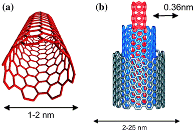 ): (a) single-walled carbon nanotubes (SWCNTs), that can be considered as a single graphene sheet rolled into a cylinder and (b) multi-walled carbon nanotubes (MWCNTs), which can be considered as stacking of concentric layers of several graphene sheets in the form of cylinders with an interspacing of 0.34 nm. Based on the atomic arrangement there are three types of structures: (1) zigzag, (2) armchair and (3) chiral structures (Fig.