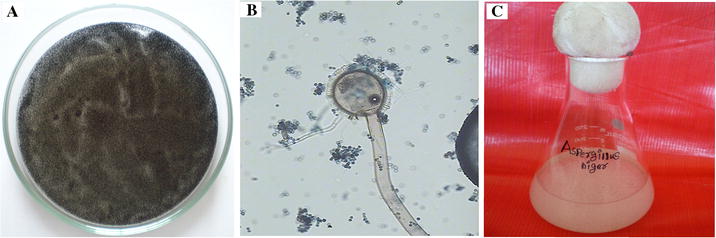 Aspergillus niger is a filamentous ascomycete fungus and group of saprophytic molds. Generally, A. niger can reproduce by means of conidia. It can grow at 6–47 °C and pH 1.4–9.8. It is an important industrial fungus used for producing citric acid, amylases, lipases, cellulases, xylanases, proteases production, and for removal of heavy metal ions from waste waters [ 24 , 25 ]. Previously, metal nanoparticles were synthesized using A. niger culture filtrate. Fungal filtrate contains enzymes, and anthraquinone compounds are more responsible for reducing and capping processes. The synthesized metal nanoparticles showed better antibacterial and larvicidal activities against bacterial pathogens and mosquito vectors [ 17 , 26 ].