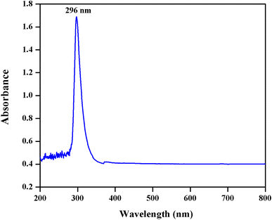 NPs were subjected to the UV–Vis spectrum analysis in the range from 200 to 800 nm continuously. It exhibited a well-defined absorption peak at 296 nm which indicates that the synthesized CeO