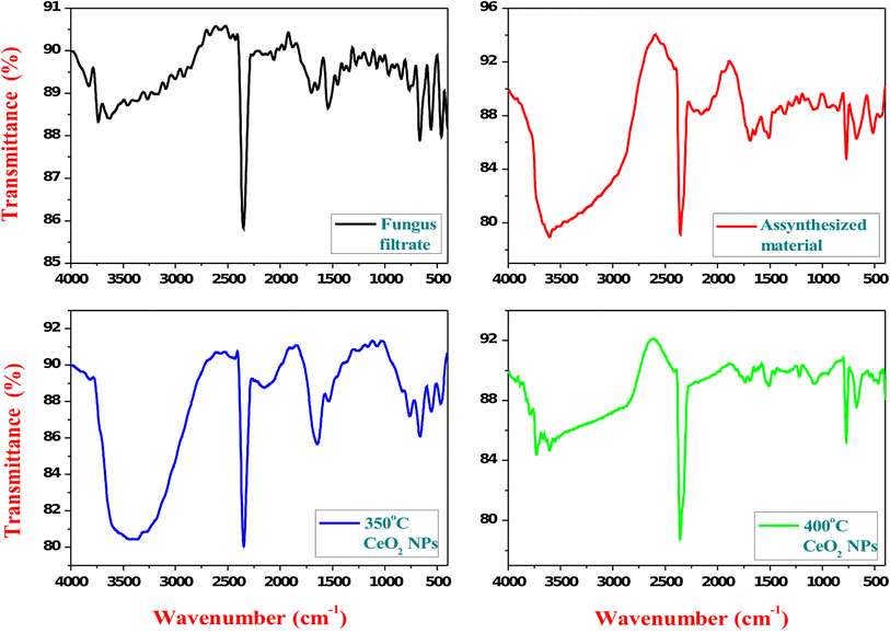 FTIR-spectra of fungal culture filtrate, as-synthesized sample, and calcined samples at 350 and 400 °CFig. 3
