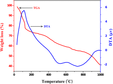 ]. The two exothermic peaks observed at 115 and 615 °C on the DTA curve represent the strong and minor peaks, respectively, which confirms the combustion of organic residues (115 °C), and decomposition of some residual, absorbed species and oxygen loss at higher temperature (615 °C) [